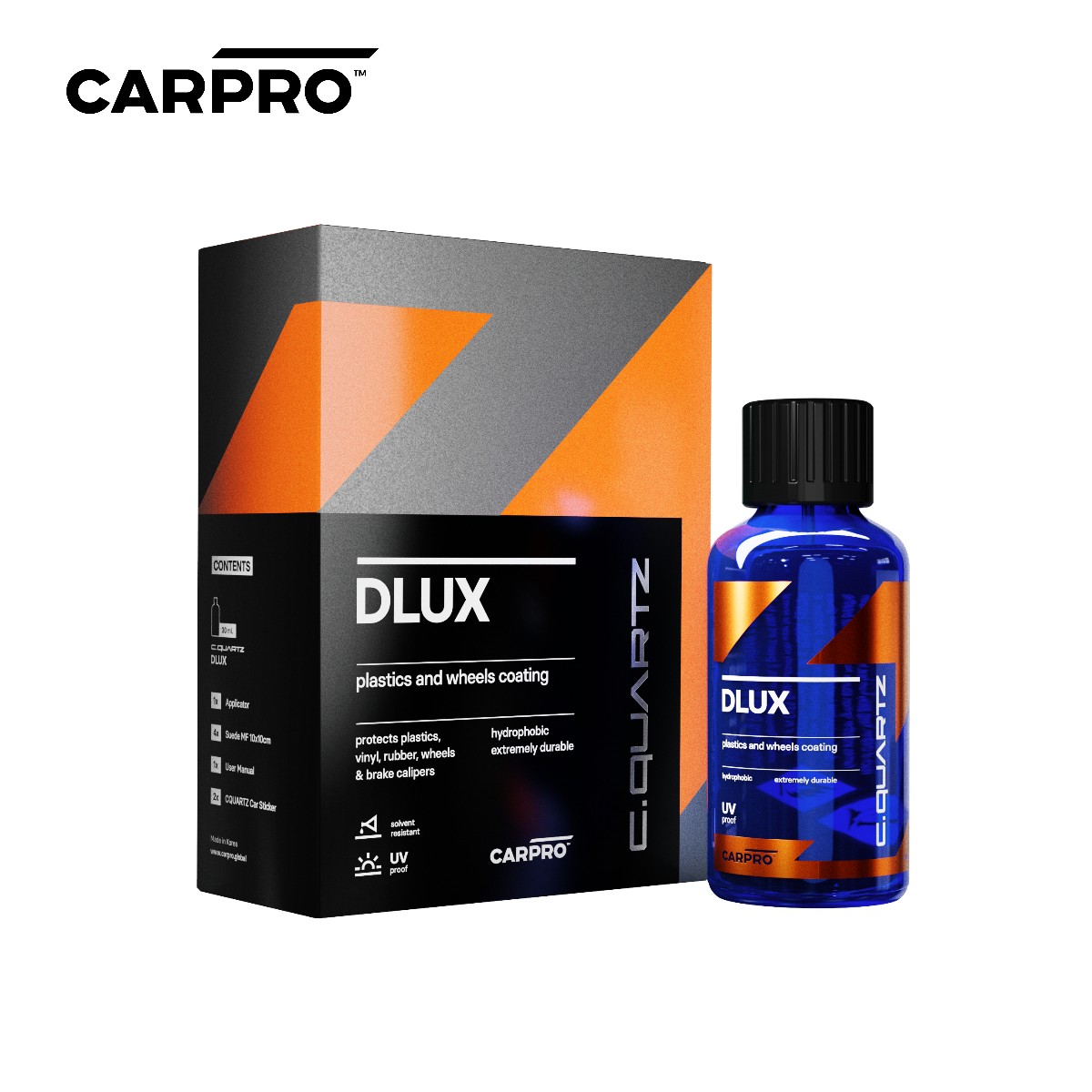 CQUARTZ Dlux არის პრემიუმ კერამიკული საფარი პლასტმასის, რეზინისა და ყველა ტიპის დისკის ხანგრძლივი დაცვისთვის. 50%-ზე მეტი სილიციუმის (SiO2) შემცველობა უზრუნველყოფს ზედაპირის რეგენერაციას, სძენს მას სიღრმეს და ქმნის მყარ დამცავ ფენას 2 წლამდე.